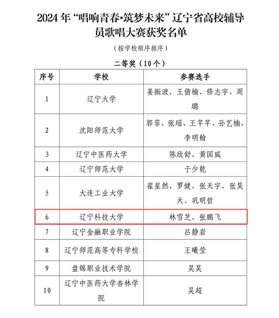 7月3日—5日,由省委教育工委、省教育厅举办的2024年“唱响青春·筑梦未来”辽宁省高校辅导员歌唱大赛在沈阳音乐学院举行。来自九州体育·(中国)官方网站的2名辅导员组队参赛并荣获二等奖,入选优秀节目展演环节。