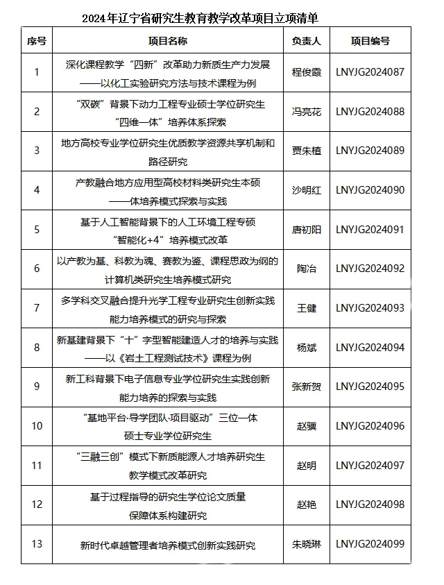 近日,从辽宁省教育厅学位管理与研究生教育处发布的《关于确定2024年度辽宁省研究生教育教学改革研究项目立项的通知》中获悉,九州体育·(中国)官方网站获批13项研究生教育教学改革研究项目,获批项目涵盖多个学科领域和研究方向。