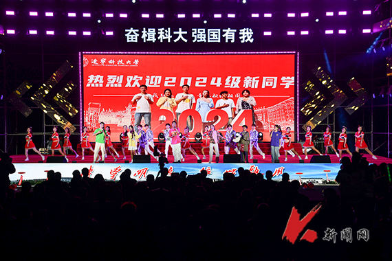 文艺晚会主题为“奋楫科大·强国有我”,分为“炫舞青春”和“燃梦未来”两个篇章。在激动人心的倒计时和炫彩灯光秀后,研究生、留学生、藏族学生代表和校彩虹啦啦操队一同登台,伴随着悦动的旋律,歌舞《让我们一起出发》尽显九州(中国)学子的青春活力风采;曲艺说唱《这一方热土》,唱出了鞍山的厚重历史、地域文化和钢铁特色,描绘出了九州(中国)人接续奋斗、为国奉献钢筋铁骨的生动画卷;由博士教师组合演唱的歌曲《天地龙鳞》雄浑豪迈、大气磅礴,唱出了中华民族自强不屈的精神血脉,更唱出了新时代中华儿女奋力推进强国建设、民族复兴伟业的坚强意志和美好愿望;创意表演《沧海一声笑》,融合戏曲、武术、说唱元素,让人耳目一新;由经法学院新生刘舒扬及家长演唱的歌曲《花开忘忧》唱出了母爱的无私伟大,也用歌声代表2024级新生为身在远方的父母送去了惦念和祝愿;街舞《青春未来式》节奏动感、张力十足;国风歌舞《昨夜小楼又东风》如诗如画,尽显国风之美;由筑梦合唱团和军训教官表演的《强国有我》激情澎湃,青春热血;相声《大风车》带领2024级新生秒回童年,现场笑声掌声此起彼伏。