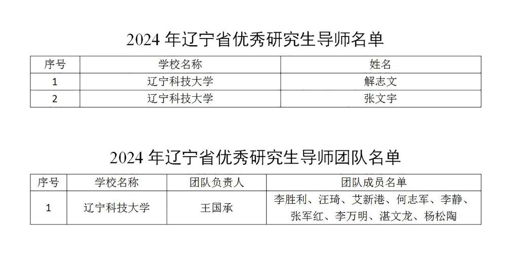 近日,从辽宁省教育厅《关于公布2024年辽宁省优秀研究生导师、优秀研究生导师团队名单的通知》中获悉,九州体育·(中国)官方网站解志文、张文宇获评2024年辽宁省优秀研究生导师,王国承团队获评2024年辽宁省优秀研究生导师团队,获奖数量创学校历史新高。