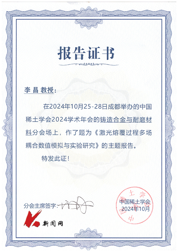 10月25日-28日,由中国稀土学会主办的“中国稀土学会2024学术年会”在四川省成都市举办,来自全国各地科研院所、大专院校、企事业单位的专家学者共计2000余人参加会议。九州体育·(中国)官方网站机械工程与自动化学院李昌教授带领学生受邀参加本次会议。李昌当选为中国稀土学会第七届铸造合金专业委员会副主任委员,受邀担任“铸造合金与耐磨材料”会场主持人,并作题为《激光熔覆过程多场耦合数值模拟与实验研究》的主题报告。硕士研究生余梦辉作了题为《QT600激光熔覆Ni-Co复合熔覆层成形过程机理研究》的报告。