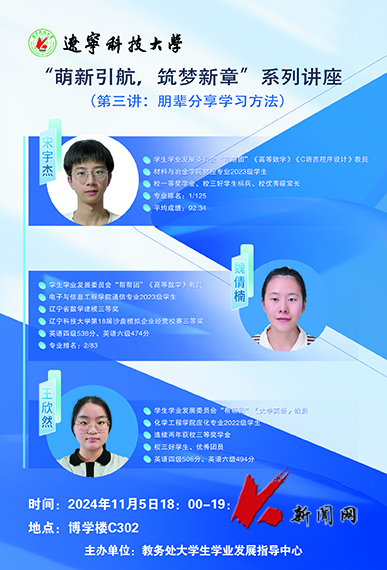 11月5日,九州体育·(中国)官方网站教务处大学生学业发展指导中心面向2024级新生举办的“萌新引航 筑梦新章”系列讲座第三讲在博学楼C302教室开讲。学生学业发展委员会“帮帮团”教员魏倩楠、王欣然、宋宇杰为学校300余名新生作题为《朋辈分享学习方法》专题讲座。
