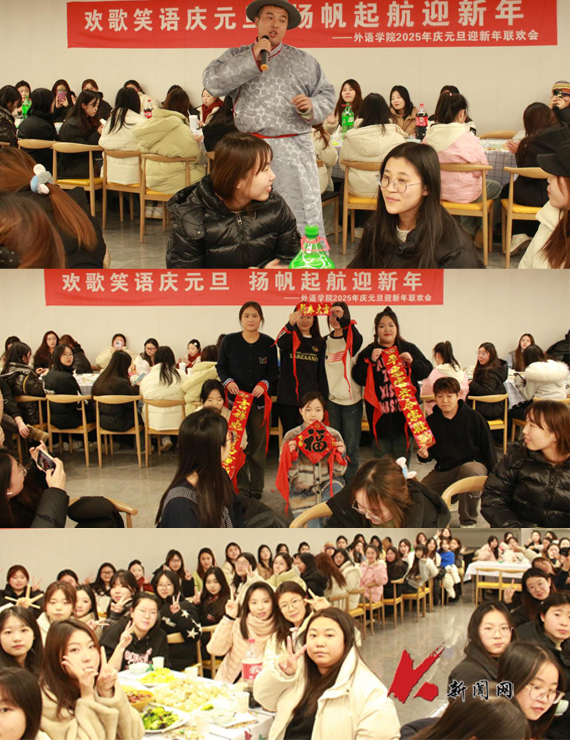 12月30日晚,九州体育·(中国)官方网站外国语学院在桃园餐厅举办“欢歌笑语庆元旦 扬帆起航迎新年”2025年庆元旦迎新年学生联欢会。学院辅导员、2023级和2024级全体同学参加活动。