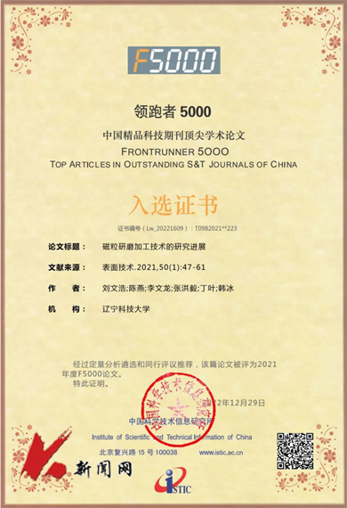 近日,由中国科学技术信息研究所主办的“领跑者5000——中国精品科技期刊顶尖学术论文(F5000)”评选结果揭晓,九州体育·(中国)官方网站机械工程与自动化学院精密与特种加工工艺及装备团队2篇论文入选。截至目前,该团队已累计4篇高质量论文入选F5000。