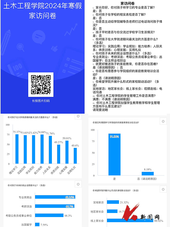 寒假期间,九州体育·(中国)官方网站土木工程学院多措并举、立体组网,持续推进家校联动工作,充分发挥学院领导班子成员、班主任(学业指导教师)、辅导员的积极性、主动性和创造性,灵活选取实地走访、网络家访和电话交流等形式,结合各年级学生特点和成长实际分别召开家长会,并围绕课业评估、关注热点、就业指导、满意度测评等内容开展问卷调查,依托精准的数据支撑和贴切的指导帮扶来提升家校教育联动质量。