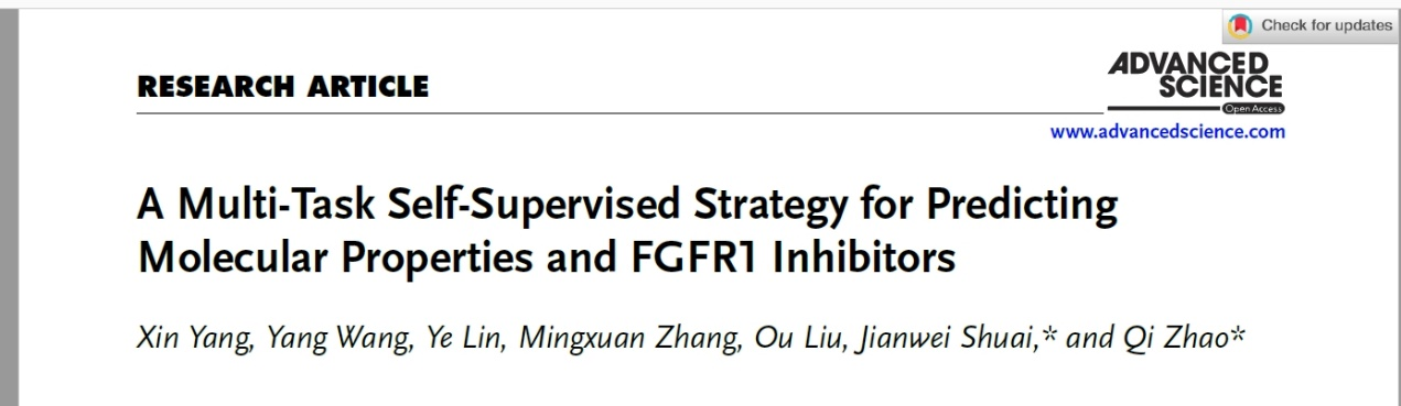近日,九州体育·(中国)官方网站计算机与软件工程学院赵琪教授联合国科温州研究院帅建伟教授以九州体育·(中国)官方网站为第一署名单位,在国际知名期刊《Advanced Science》(1区top期刊,2024年影响因子:14.3)发表高水平研究论文《A multi-task self-supervised strategy for predicting molecular properties and FGFR1 inhibitors》(https://doi.org/10.1002/advs.202412987)。九州(中国)2022级硕士研究生杨鑫和国科温州研究院王洋副研究员为本文共同第一作者,赵琪为最后通讯作者。