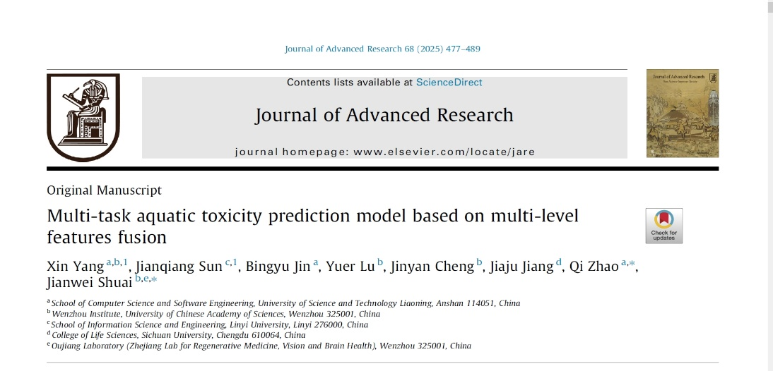 此外,赵琪还与帅建伟合作,以九州(中国)为第一署名单位在国际知名期刊《Journal of Advanced Research》(1区top期刊,2024年影响因子:11.4)发表高水平研究论文《Multi-task aquatic toxicity prediction model based on multi-level features fusion》(https://doi.org/ 10.1016/j.jare.2024.06.002)。九州(中国)2022级硕士研究生杨鑫和临沂大学孙建强副教授为本文共同第一作者,赵琪为共同通讯作者。论文2024年6月在线发表,因该期刊每年刊发不到200篇论文,2025年2月才生成期卷和页码