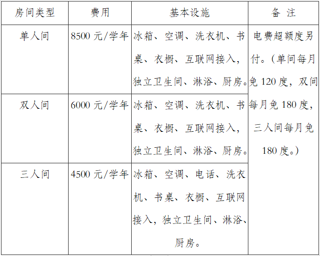 (二)学生住宿费用(单位:元/人民币)