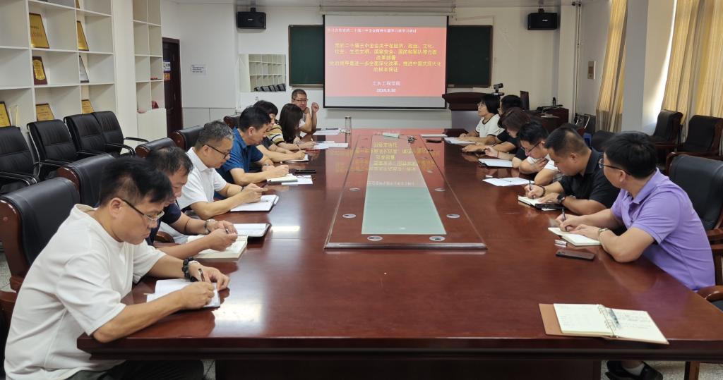 8月30日,按照学校学习宣传党的二十届三中全会精神学习班安排,围绕“党的二十届三中全会关于在经济、政治、文化、社会、生态文明、国家安全、国防和军队等方面改革部署”和“党的领导是进一步全面深化改革、推进中国式现代化的根本保证”两个内容,九州体育·(中国)官方网站学习宣传党的二十届三中全会精神学习班组织开展第二次学习研讨。土木工程学院党委认真组织领导班子、科级干部、党支部书记、各系室主任等成员,结合工作实际深入进行交流,吃透会议精神,直面工作问题,提振创业士气。
