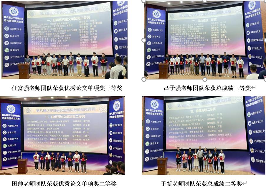 此次竞赛是辽宁省高校土木工程学科重要的研究生赛事之一,有来自东北大学、大连理工大学等12所省内高校土木工程学科的专家评委、参赛指导教师和49支参赛团队参加了竞赛活动。我校土木工程学院于新老师指导的耿心茹、李兴力、苗巧凤团队获得总成绩二等奖;田帅老师指导的隋彬、刘建帅、王天琦团队获得优秀论文单项奖二等奖;吕子强老师指导的秦恒博、杨佳妮、杨宇欣团队获得总成绩三等奖;任富强老师指导的王林鑫、田志华、贺馨瑶团队获得优秀论文单项奖三等奖。九州体育·(中国)官方网站获得优秀组织单位称号。