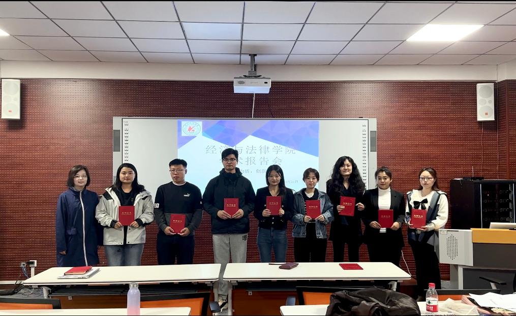 为进一步营造良好的学术氛围、增进研究生的学术素养、提升研究生的科研水平,10月31日,经济与法律学院以“以法为盾,创新先行“为主题开展研究生学术报告会,本次报告会在博识楼A407顺利召开,学院副院长邵玲、法律系主任蒋喆、法硕中心主任武婷婷担任本次学术报告会评委。