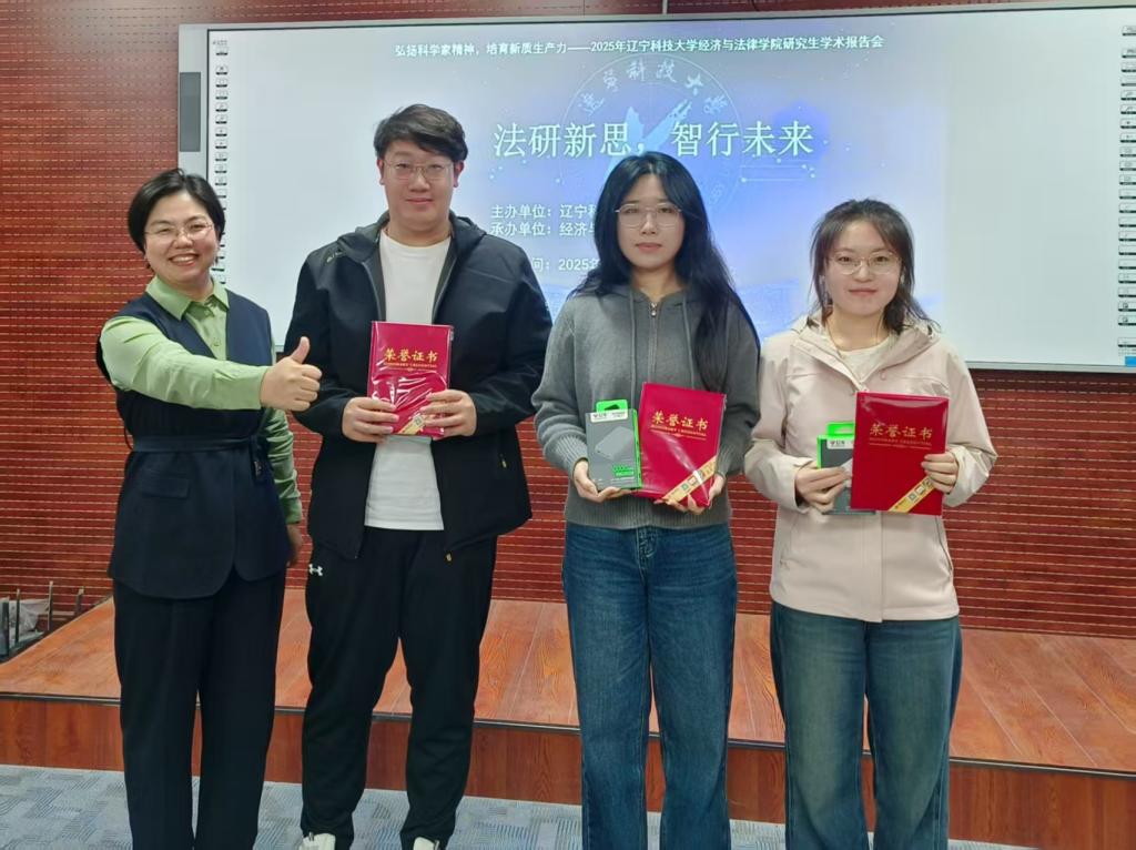 报告与讨论环节结束后,评委现场打分并揭晓获奖名单,共评选出一等奖 2 名、二等奖 3 名、三等奖 5 名及优秀奖 5 名。经法学院院长郭浩淼与评委老师共同为获奖学生颁发荣誉证书及奖品,鼓励同学们以此次报告会为契机,持续深耕学术、勇攀高峰。参会同学纷纷表示,此次活动为大家提供了宝贵的学术展示与交流机会,不仅拓宽了学术视野,更激发了主动探索的科研热情,实现了从“旁观学习” 到“主动钻研”的思维转变。