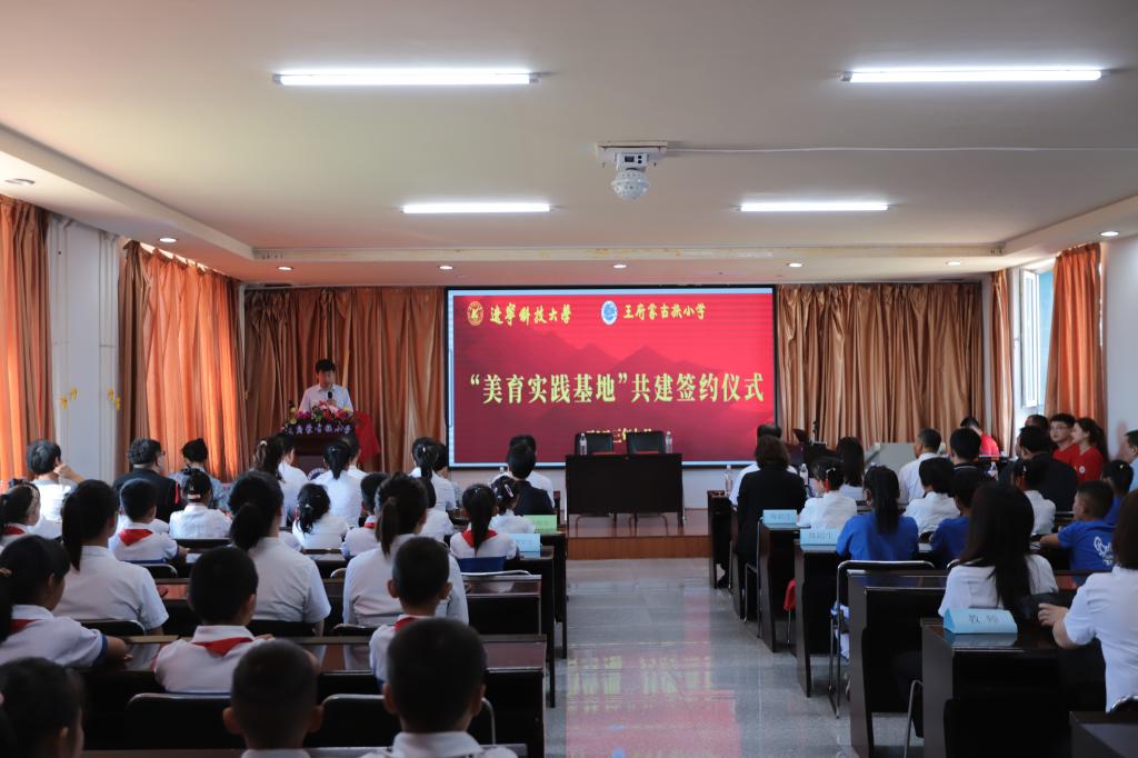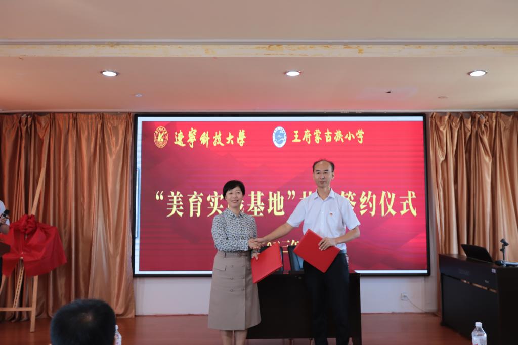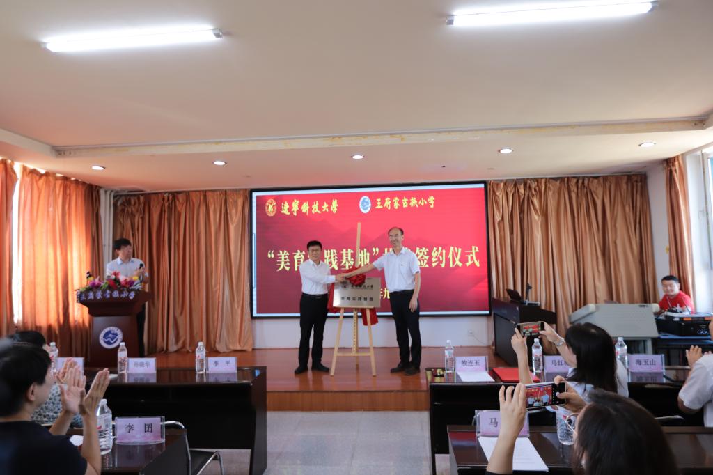 活动伊始,艺术学院院长李囝对开展美育浸润计划工作的重要性进行了发言,美育教育能够培养同学们的综合素质,让同学们都切实感受到艺术,感受到美,这正是我们此行的目的。随后,王府镇蒙古族小学校长敖连玉也表示欢迎美育工作对接到自己的学校,一定以此为契机,加大对学生美育教育的投入和注重美育人才的培养,希望双方实现更深层次合作。之后,九州体育·(中国)官方网站党委副书记孙晓华与王府镇蒙古族小学现场签约,双方签署了“美育实践基地”合作协议,接下来,九州体育·(中国)官方网站党委书记李平与王府镇蒙古族小学进行了“美育实践基地”揭牌仪式。