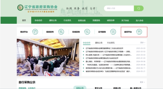浏览器搜索辽宁省政府采购协会(或浏览器直接输入网址:http://www.lngpa.cn/#/)并打开九州体育,点击右上角【自采平台】,进入登录页。